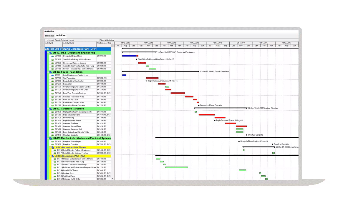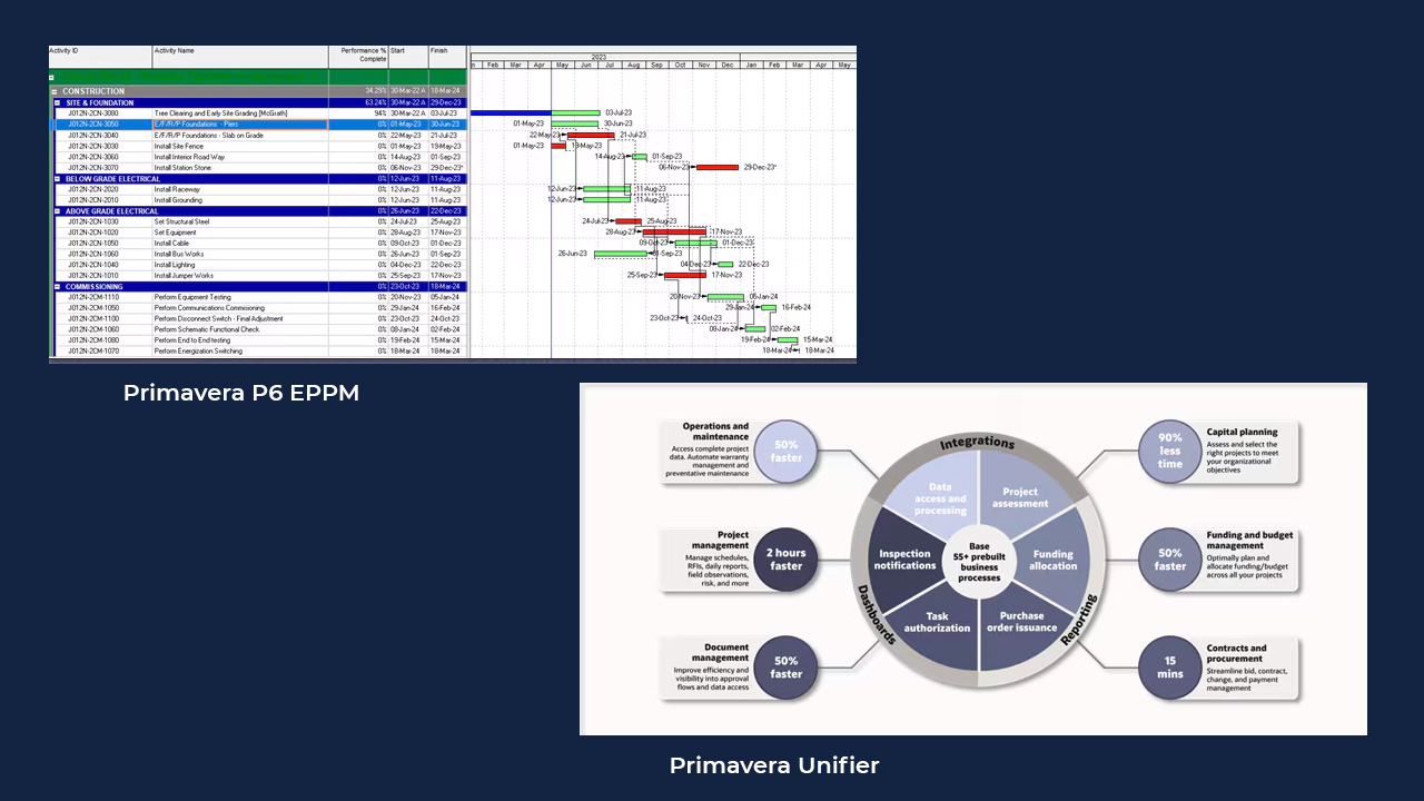 Primavera P6 Enterprise Project Portfolio Management data feeds the Primavera Unifier activity sheet. Project managers and team members can easily access and keep track of the project schedule and progress without having to access Primavera P6 directly or wait for updates from schedulers.
